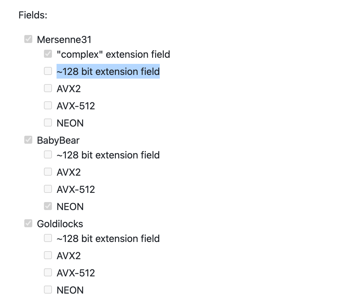 Can we simply use these smaller fields and then employ their extensions when necessary (e.g., for EC operations)? Most operations can be done in the small fields, while operations that require larger fields can be done in the extension field. This seems to be what the 'Plonky3' team is after as they note adding 128 bit extensions fields, as a feature. ⚠️ This may just be an artifact in the code-base.